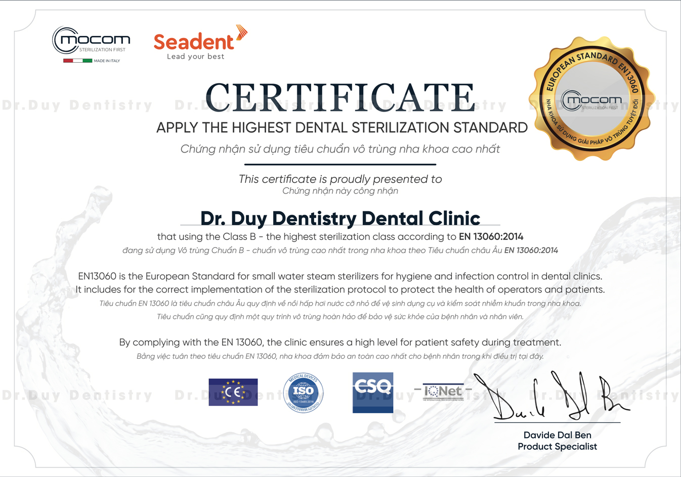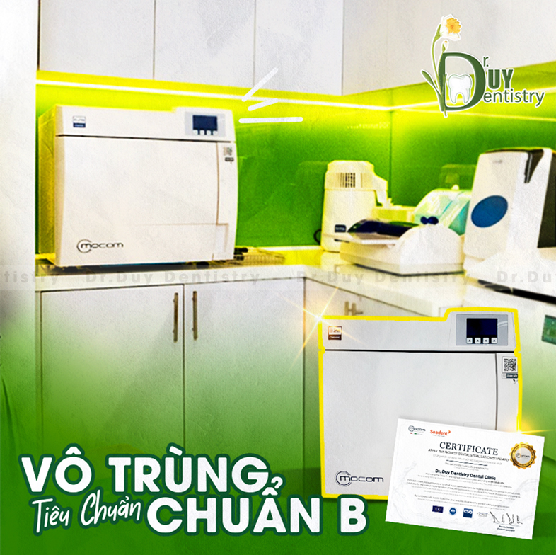 Việc đáp ứng tiêu chuẩn vô trùng nha khoa cũng được xem là căn cứ để chọn phòng khám tốt, chọn địa chỉ xứng đáng để trao gửi niềm tin. Đây cũng là điểm cộng nổi bật của phòng khám Nha khoa Dr. Duy Dentistry. Bởi phòng khám đã nhận được chứng nhận tiêu chuẩn vô trùng Chuẩn B. Đây là chứng nhận sử dụng tiêu chuẩn vô trùng nha khoa cao nhất theo tiêu chuẩn châu Âu EN 13060-2014.