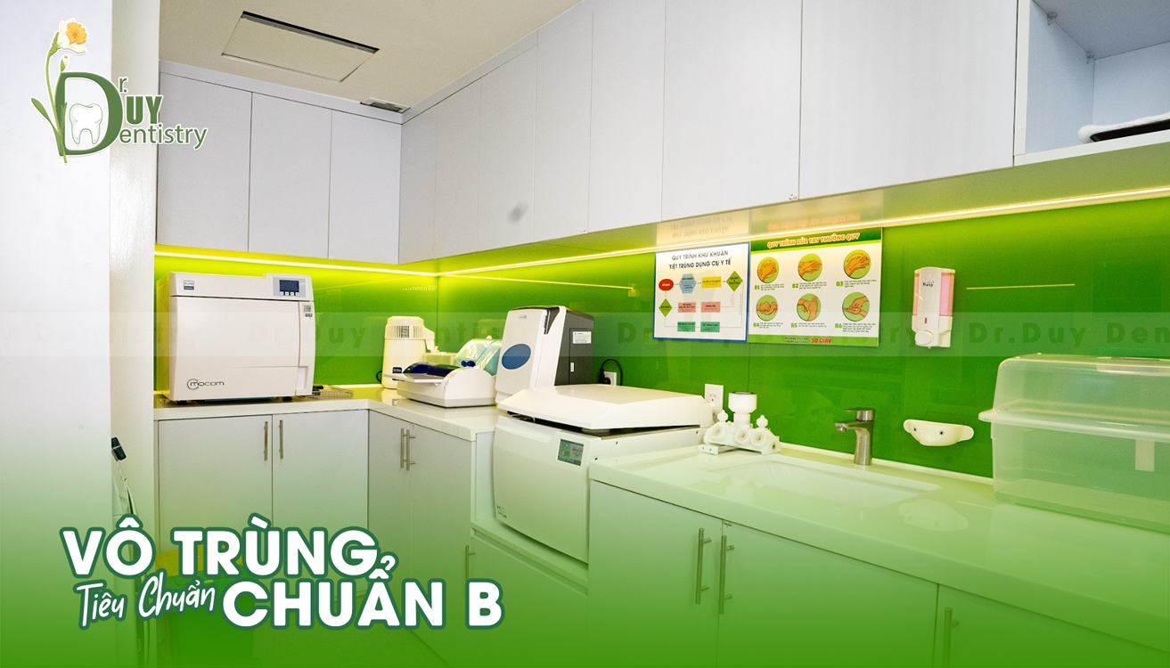 Không gian phòng khám hiện đại, rộng rãi; đội ngũ kỹ thuật viên chuyên nghiệp, tận tình sẽ giúp bệnh nhân luôn trong tâm thế thoải mái, an tâm khi lựa chọn đến cơ sở của chúng tôi. Đặc biệt, Dr. Duy Dentistry đảm bảo đáp ứng chuẩn an toàn - phòng khám đã nhận được chứng nhận tiêu chuẩn vô trùng Chuẩn B. Đây là chứng nhận sử dụng tiêu chuẩn vô trùng nha khoa cao nhất theo tiêu chuẩn châu Âu EN 13060-2014.