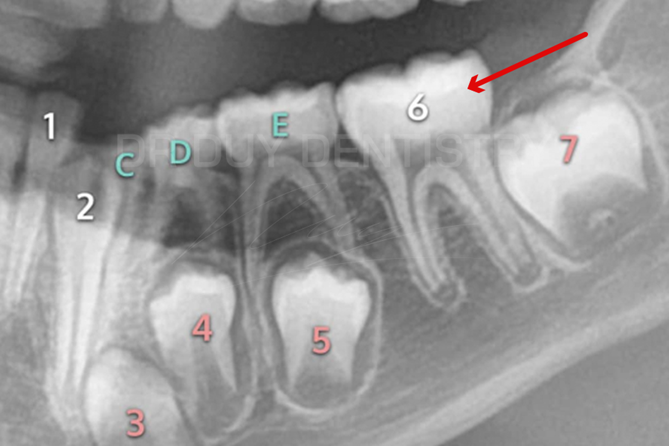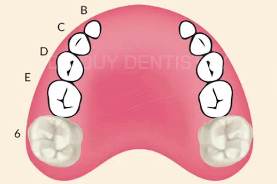 - Răng số 6 mọc lên ở vị trí phía sau răng cối sữa thứ 2 và không thay thế cho các răng sữa trước đó.