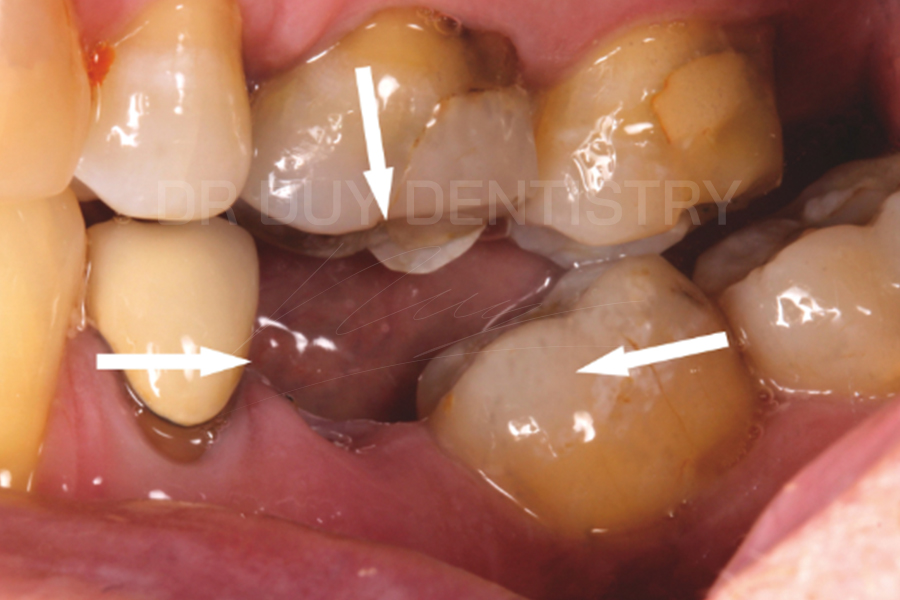 - Sai lệch khớp cắn do các răng lân cận nghiêng, lệch cũng như răng số 6 hàm đối diện trồi vào khoảng trống do mất răng.